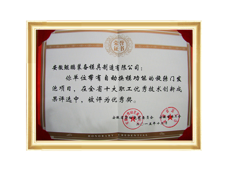 十大職工優(yōu)秀技術(shù)獎(jiǎng)自動(dòng)換模旋轉(zhuǎn)門發(fā)優(yōu)秀獎(jiǎng)證書