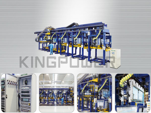 該發泡線由預熱烘爐、動力滾筒線、進箱90°轉向機(含箱體識別)、雙向運載系統(可含自動充氮裝置)、發泡夾具、自動充注系統、出箱頂升平移機、外模水加熱系統以及配套氣動系統、電控系統等部分組成。